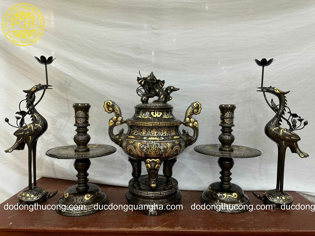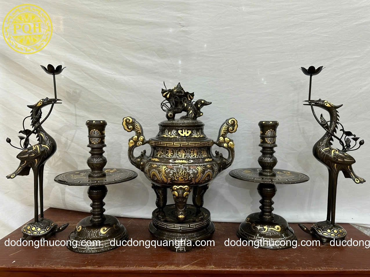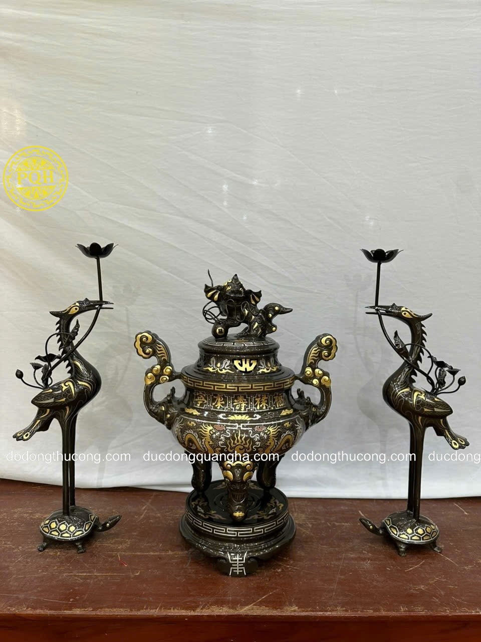 Tên gọi sản phẩm: Bộ đỉnh đồng đỏ khảm tam khí dát điểm vàng