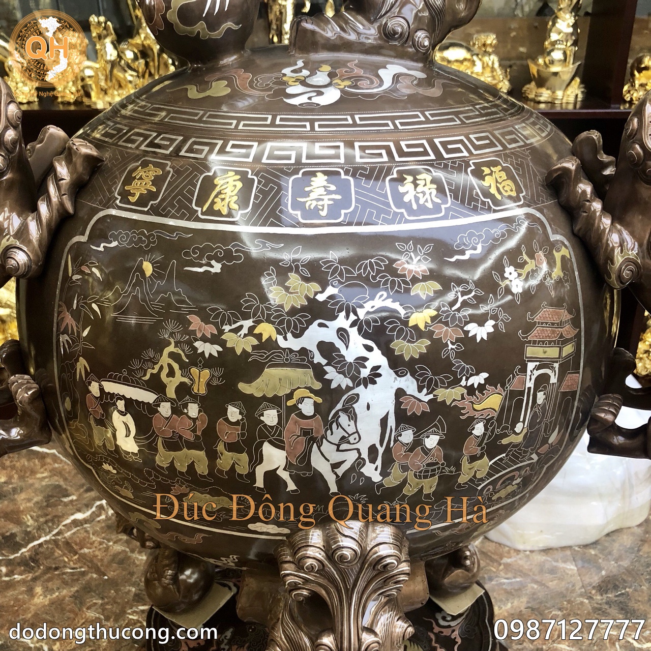 Chất liệu: Đổng đỏ nguyên chất, đúc thủ công. Khảm ngũ sắc ( vàng 9999, bạc, đồng đỏ, đồng vàng, đồng xanh )