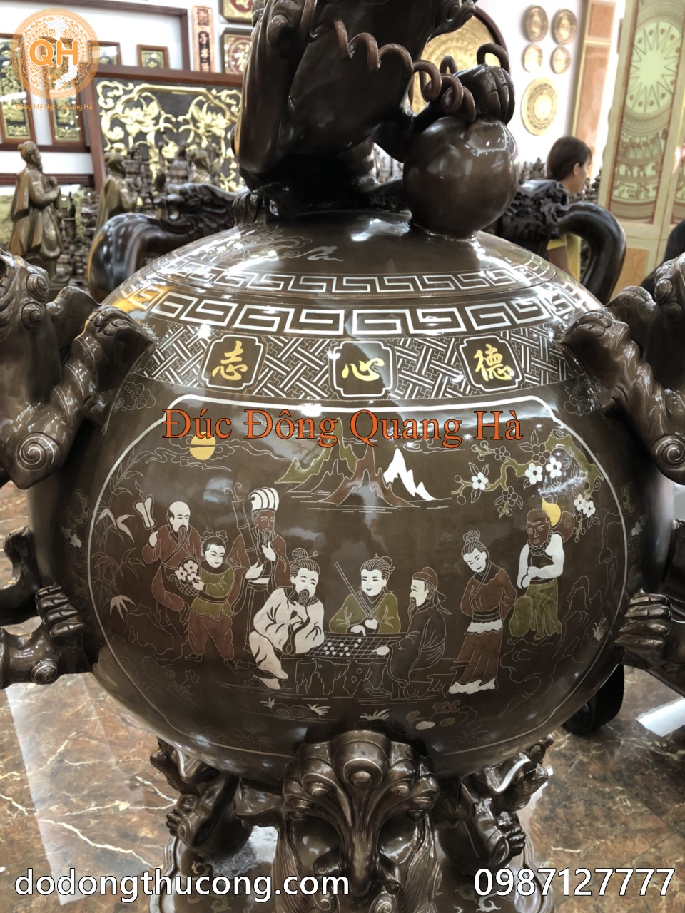 Chất liệu: Đổng đỏ nguyên chất, đúc thủ công. Khảm ngũ sắc ( vàng 9999, bạc, đồng đỏ, đồng vàng, đồng xanh )