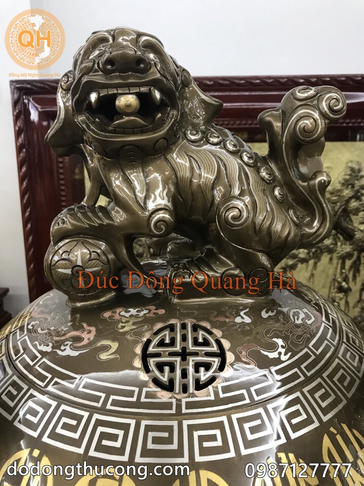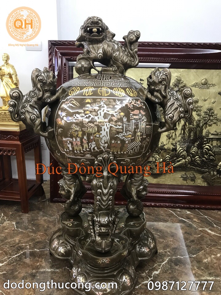 Tên gọi sản phẩm: Đỉnh thất lân vờn cầu khảm ngũ sắc hàng đặt riêng của khách hàng, khảm 5 chữ vàng Gia Tộc Họ Dương Đình