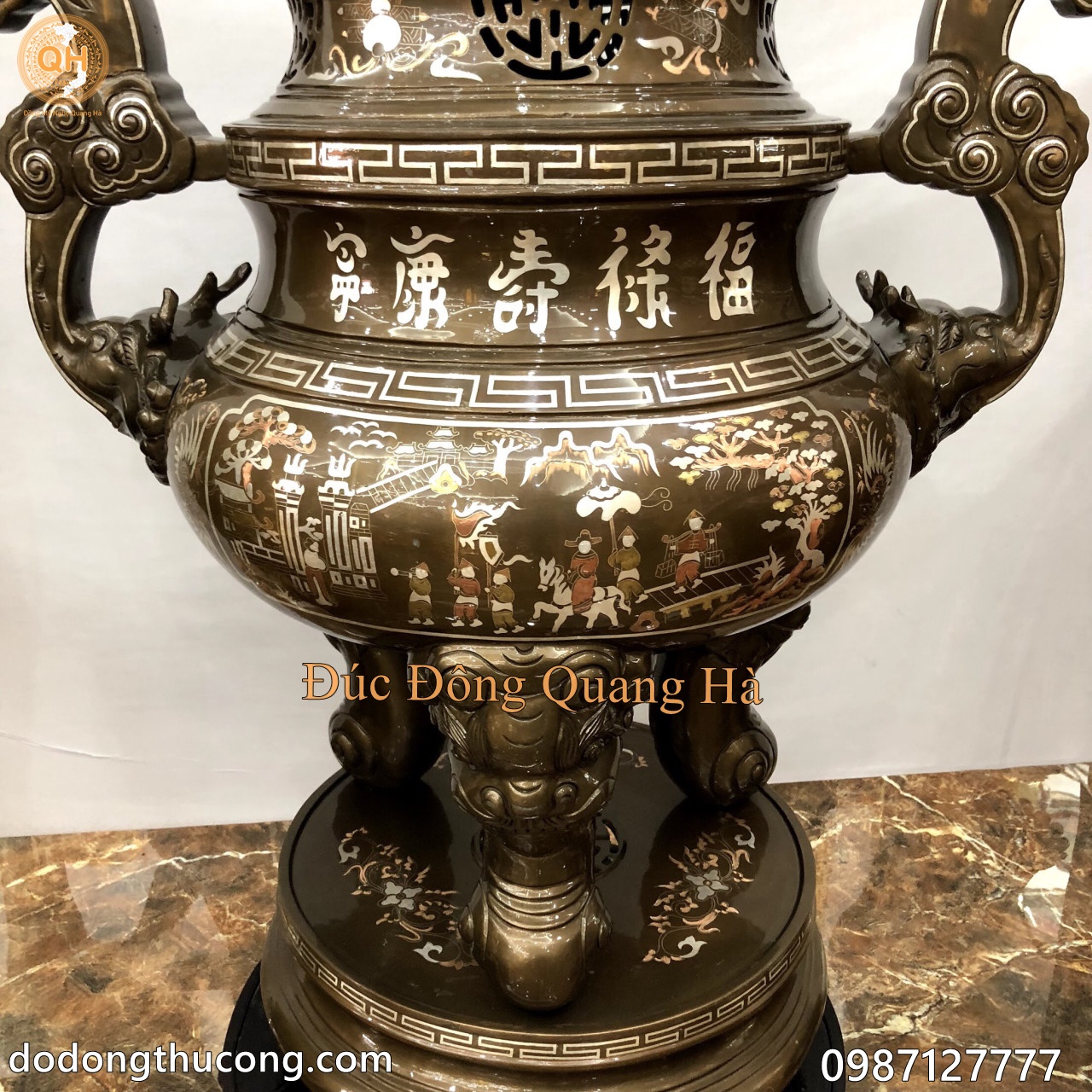Chất liệu: Đồng đỏ nguyên chất, đúc thủ công, khảm tam khí ( bạc, đồng đỏ, đồng vàng, )