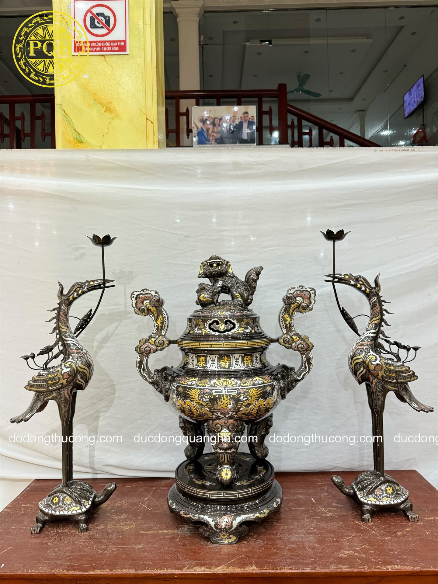 Chất liệu: Đồng đỏ nguyên chất, đúc thủ công, khảm ngũ sắc (vàng 9999, bạc, đồng đỏ, đồng vàng, đồng xanh )