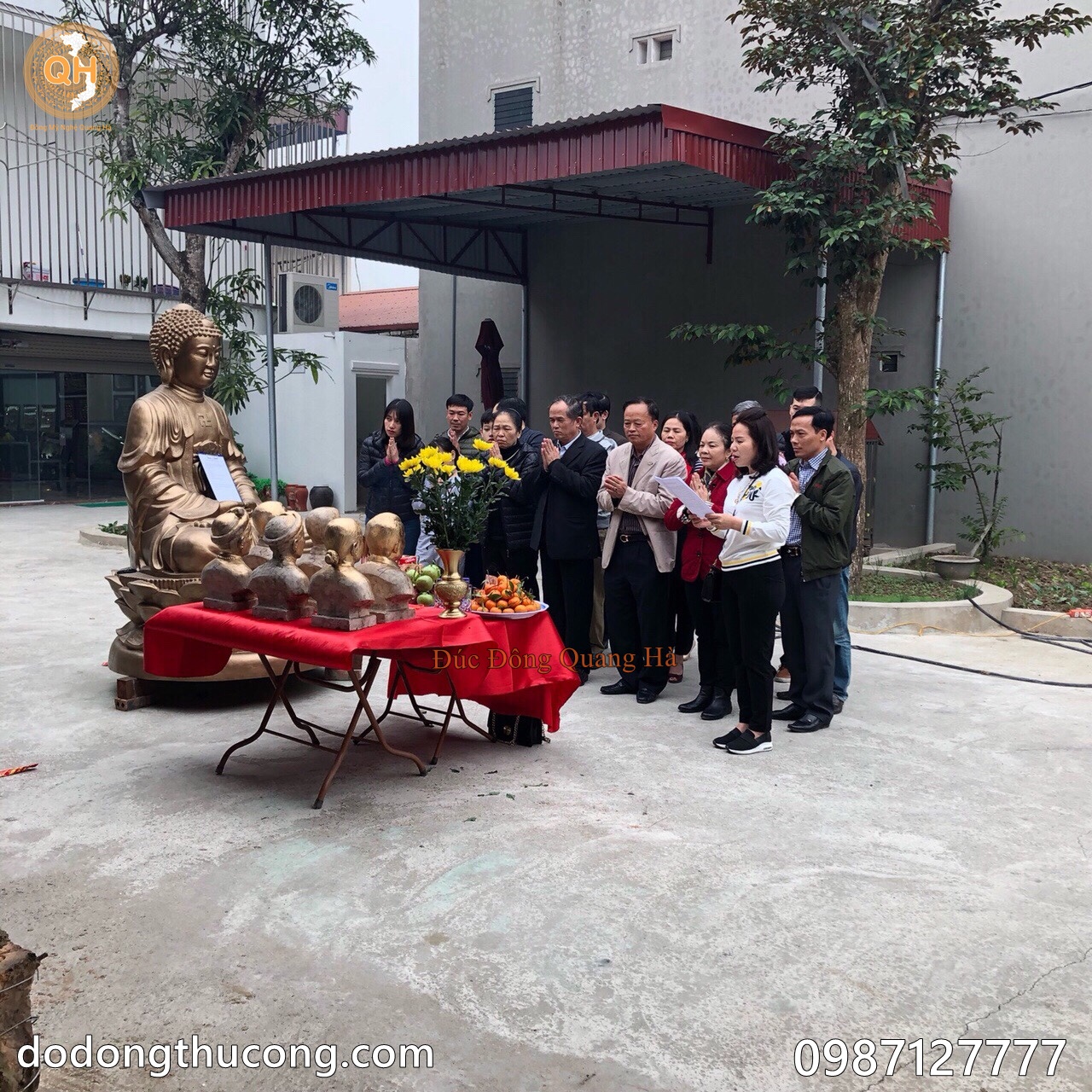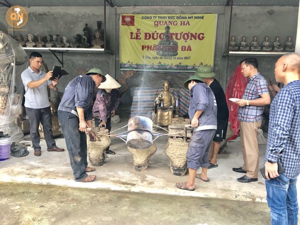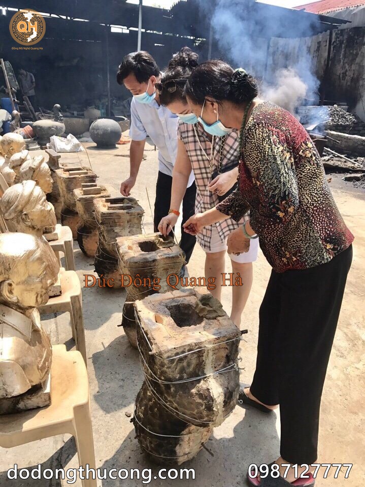 Khi đã chuẩn bị xong khâu đúc quý khách hàng có thể về trực tiếp tại xưởng đúc để làm lễ và xem quá trình các nghệ nhân đúc tượng, trong quá trình đúc quý khách hàng có thể bỏ Vàng vào pho tượng để thêm phầm ý nghĩa và quan niệm của tùng người.