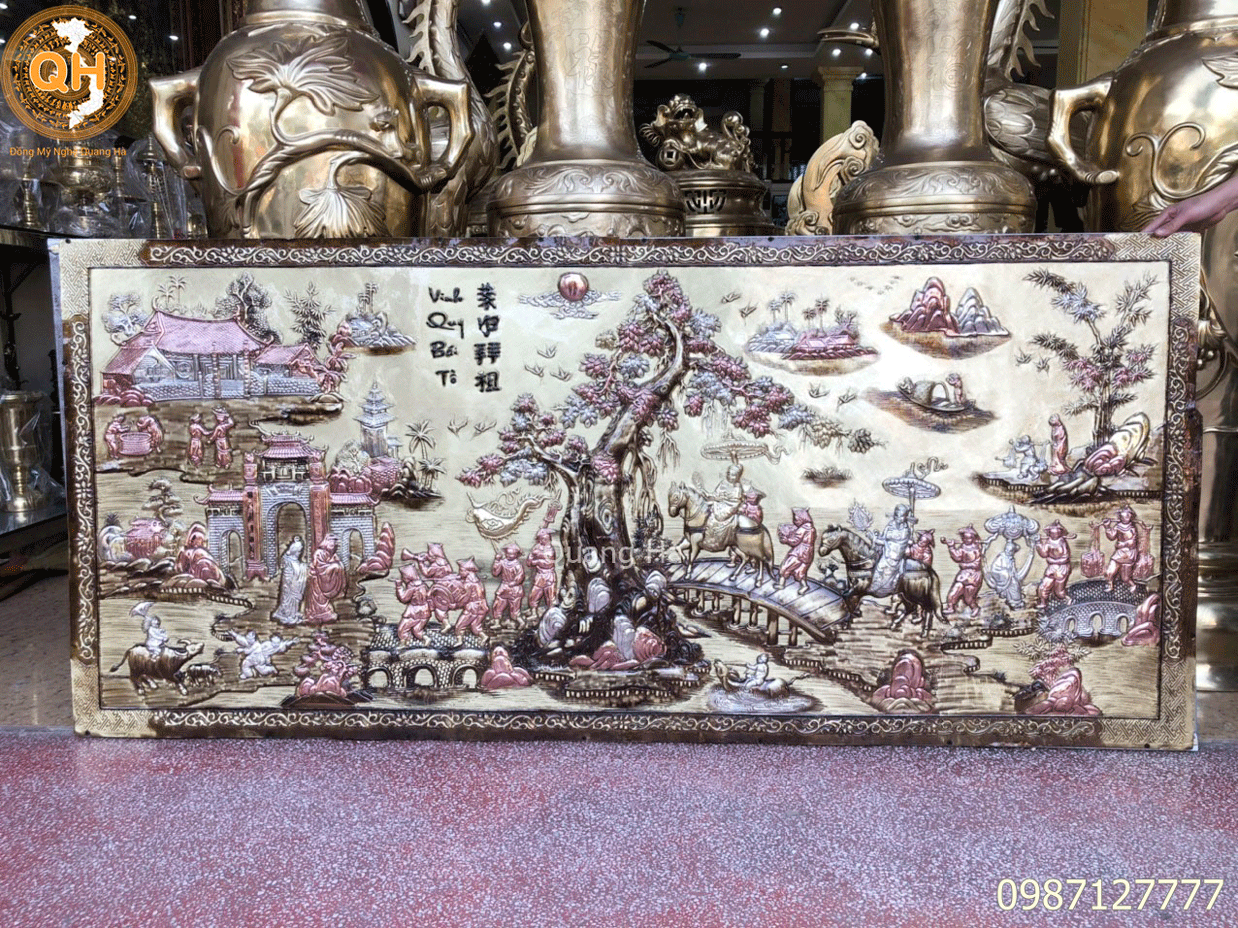 Chất liệu: Bức tranh được chạm thủ công bằng tấm đồng theo khổ (đồng đỏ hoặc đồng vàng) dày từ 5rem, 8rem đến 1ly2 theo yêu cầu của quý khách hàng.